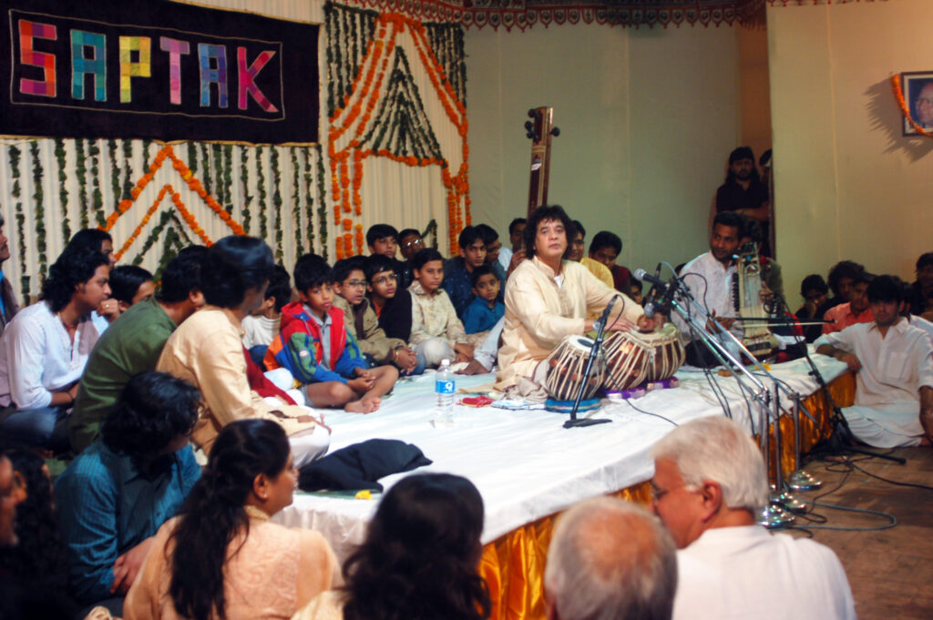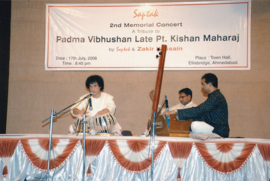 In 2008, following the passing of Pt. Kishan Maharaj ji, Zakir ji expressed his desire to pay tribute to Pt. Kishan Maharaj ji to Nandan ji. Thus, a special Tabla solo concert was organized at the Town Hall on July 17, 2008, as a tribute to Maharaj ji. His incredible performance served as a fitting tribute, offered by both Saptak and Zakir ji together.